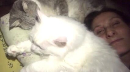 Как мы с котиками Сеней и Белой вместе на одной подушке спим .