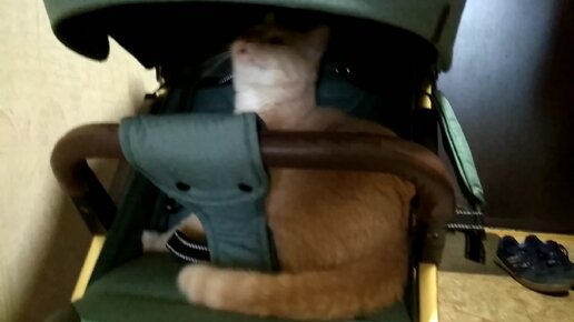 Кот Персик оценивает новую прогулочную коляску для сына