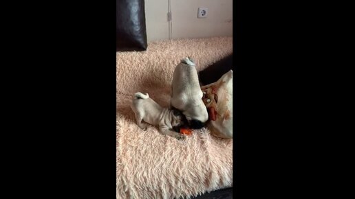 Смешная битва мопсов: щенок пытается свалить молодую собаку!