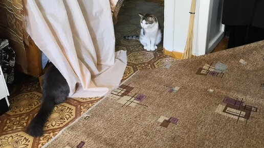 Пуся ревнует и устраивает ловушки - засады новой кошке :)