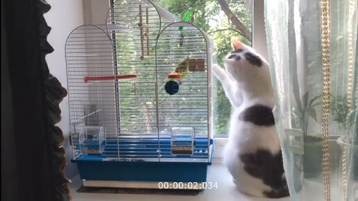 Знакомство кошки с попугаем 2. Почти любовь)30 минут в 30 секундах.
