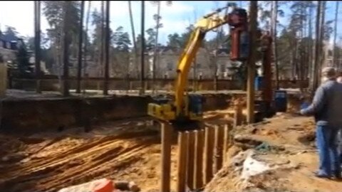 Рытье котлована и монтаж шпунтового ограждения. Экскаваторы в деле.