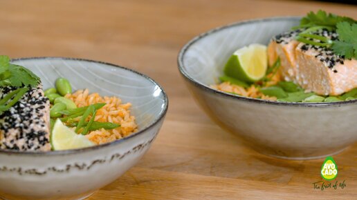 Авокадо боул с лососем на подушке из риса. Видео-рецепт.
