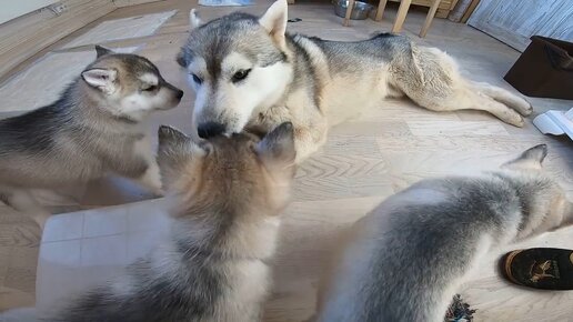 Серый Волк хаски Играет со своими щенками