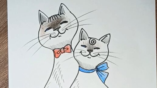 Кот и кошка - семейный портрет, как нарисовать маркером и карандашами.