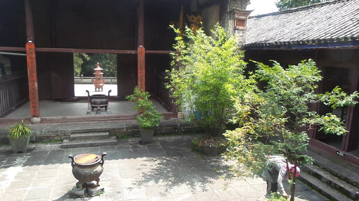послушница китайского дзен храма У Вэй собирает мяту с клумбы во внутреннем дворике перед залами Архатов
