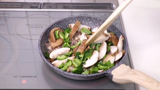 Грибы Шиитаке, жареные с мясным фаршем и зеленым перцем.