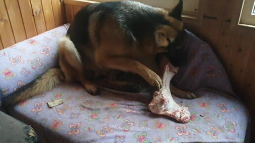 Немецкая овчарка грызёт большую кость: и игрушка, и вкусняшка
