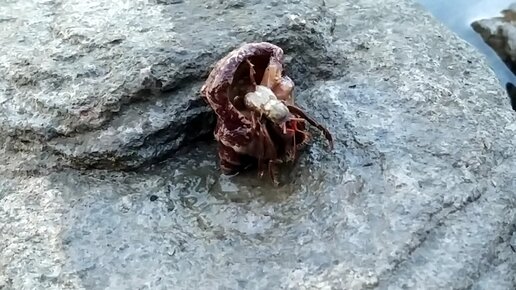 Большой рак-отшельник крупным планом в раковине от рапана,пытается убежать в море