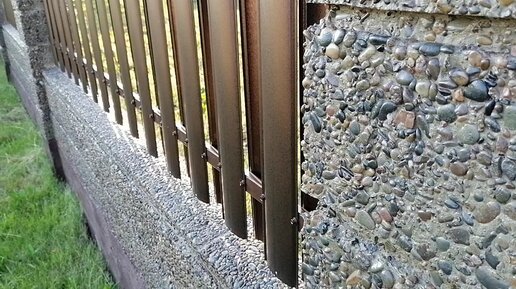 Забор из самодельных блоков «мытый бетон» и металлоштакетника