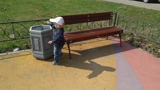 Двухлетний ребёнок убирает за взрослыми мусор на детской площадке
