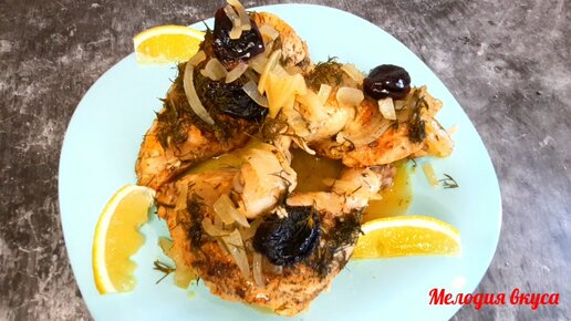 Жаркое из курицы с черносливом, лимоном и зеленью.