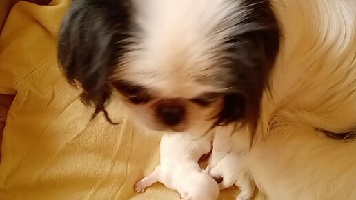 Щенкам только третьи сутки. Один уже партизанит. Какие они, трехдневные японские хины.