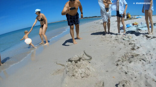Змея захватила замок, который построили дети из песка на пляже в Крыму