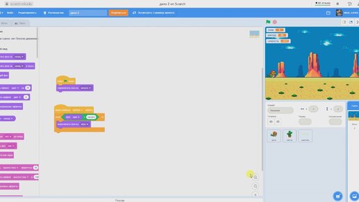 Программирование на скретче. Запрограммировали динозаврика который перепрыгивает через кактусы.