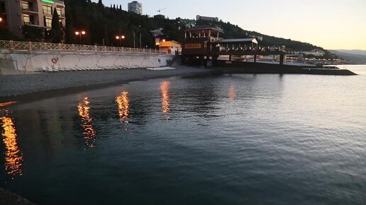 Гладь поверхности Чёрного моря и отражения фонарей на набережной Алушты в предрассветный час