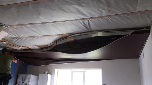 Двухуровневый натяжной потолок на кухне в деревянном доме