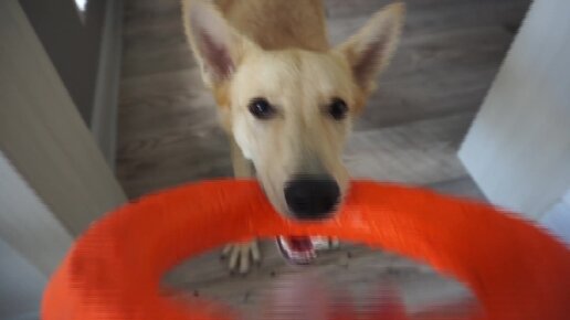 Моя собака выполняет команды и играется с дразнилкой