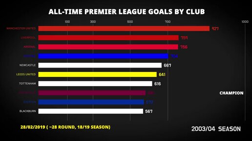 Инфографика по количеству голов клубов за всю историю АПЛ. «Манчестер Сити» нет даже в топ-5