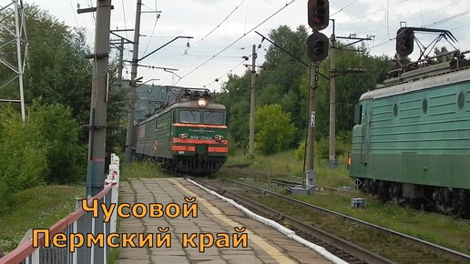 Советский электровоз с грузовым поездом РЖД, пригородный идёт через реку Чусовая