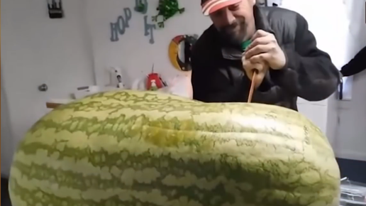 "Внутри, наверное, сахарная сочная мякоть": В предвкушении эпического момента мужчина разрезал 130-килограммовый арбуз!!!