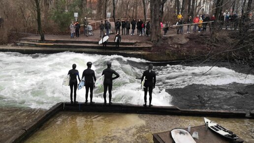 Крутые немецкие серферы в центре Мюнхена. Температура около 0С.