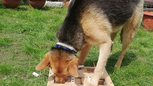 Собака пробует разгадать головоломку