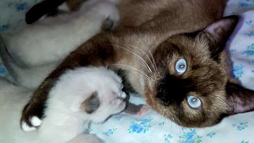 Сиамская материнская любовь. У меня пополнение-пять серых комочков.