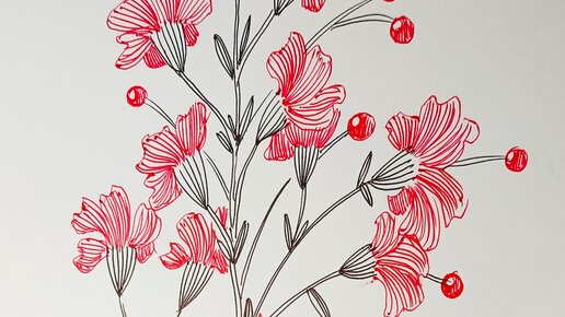 Изящный красный цветок - простой рисунок двумя шариковыми ручками.