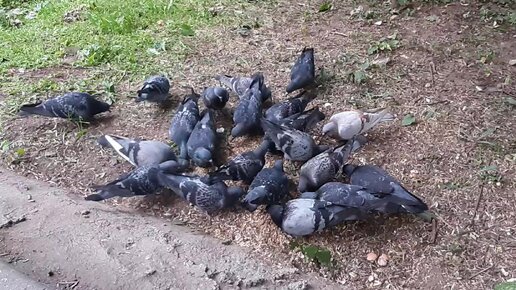 Кормление голубей во дворе.