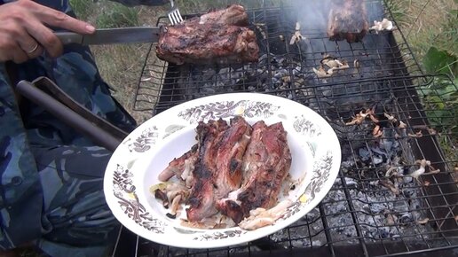 Шашлык из свиных ребер🍖 в луковом🧅 маринаде на решетке на углях...