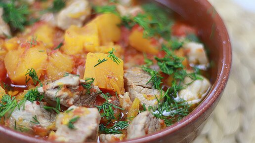 Блюдо ДЛЯ ВСЕЙ СЕМЬИ\Свинина томленая с тыквой в томатном бульоне в горшочке