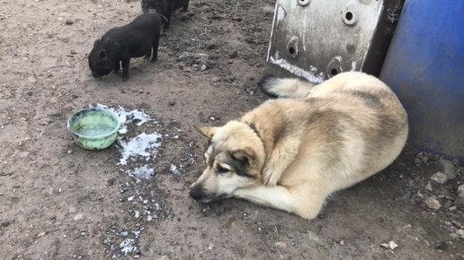 Пес Чак охраняет кефир от поросят. Такой смешной.