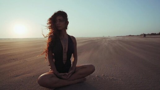 Красивая мулатка с татуировками медитирует на фоне пустыни