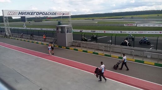 Финальные приготовления и старт мотогонок. Вид с трибуны над боксами.