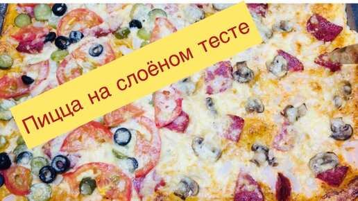 Пицца с двумя видами начинки на одном листе слоёного теста: получается вкусное сочетание - начинка сочная, а тесто тонкое