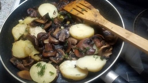 В лесу грибов нет, жарю покупные шампиньоны. С ними же будут и пироги.