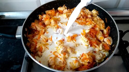 Обжариваем лук, морковь и куриную грудку, залив сливками. Вкуснотища.