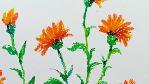 Ноготки - простой рисунок для начинающих художников. Скетч масляной пастелью.
