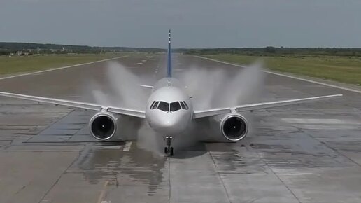 Испытания МС-21 по защите от попадания воды в двигатели.
