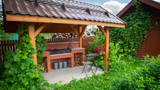 Навес для мангала, кирпичный стол и как разжечь угли с помощью стартеров.