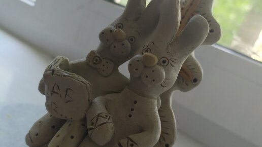Горка сувенир с зайцами из белой глины. ( ручная работа, своими руками.)