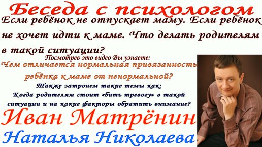 Если ребёнок не отпускает маму. Если ребёнок не хочет идти к маме. Что делать родителям в такой ситуации? Беседа с психологом.