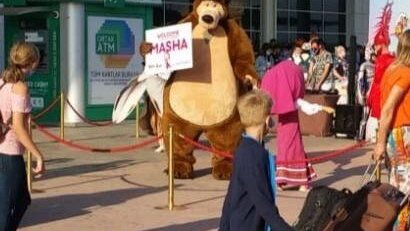 Медведь с табличкой встречал первый самолет из России в Турции