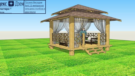 Проект беседки 4х4 метра из четырех столбов и двухъярусной крышей
