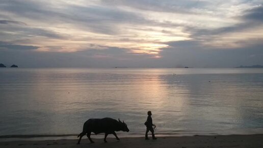 Таец выгуливает буйвола на закате. Остров Самуи, Таиланд