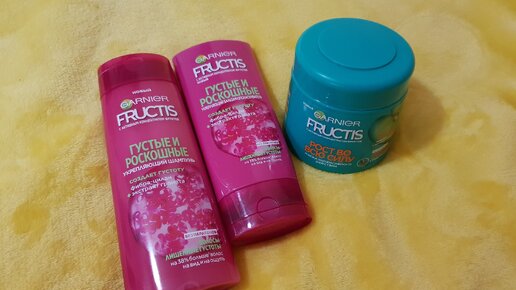 Купила шампунь и бальзам для волос Garnier Fructis из серии "Густые и роскошные" и маску из серии "Рост во всю силу"