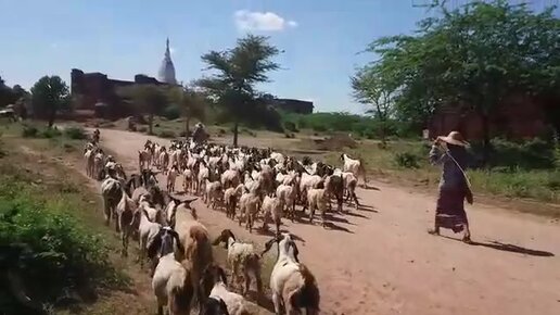 Пастух ведет стадо коз. Баган, Мьянма.
