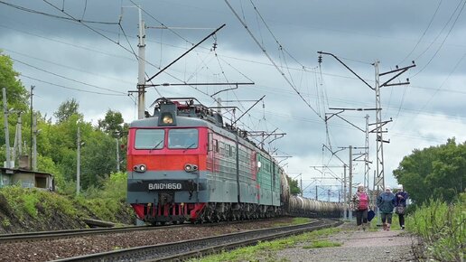 Пешеходы перед грузовым поездом под электровозами ВЛ10УК