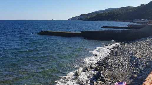 Галечный пляж и море в Крыму, в Алуште, пансионат